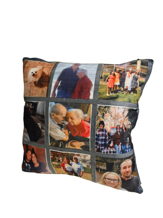 Blankets are 40 x 60 and holds up to 20 pictures. Pillows are 14 x 14 and hold up to 9 pictures. Baby blankets are also available. Please contact me by email for customizing.